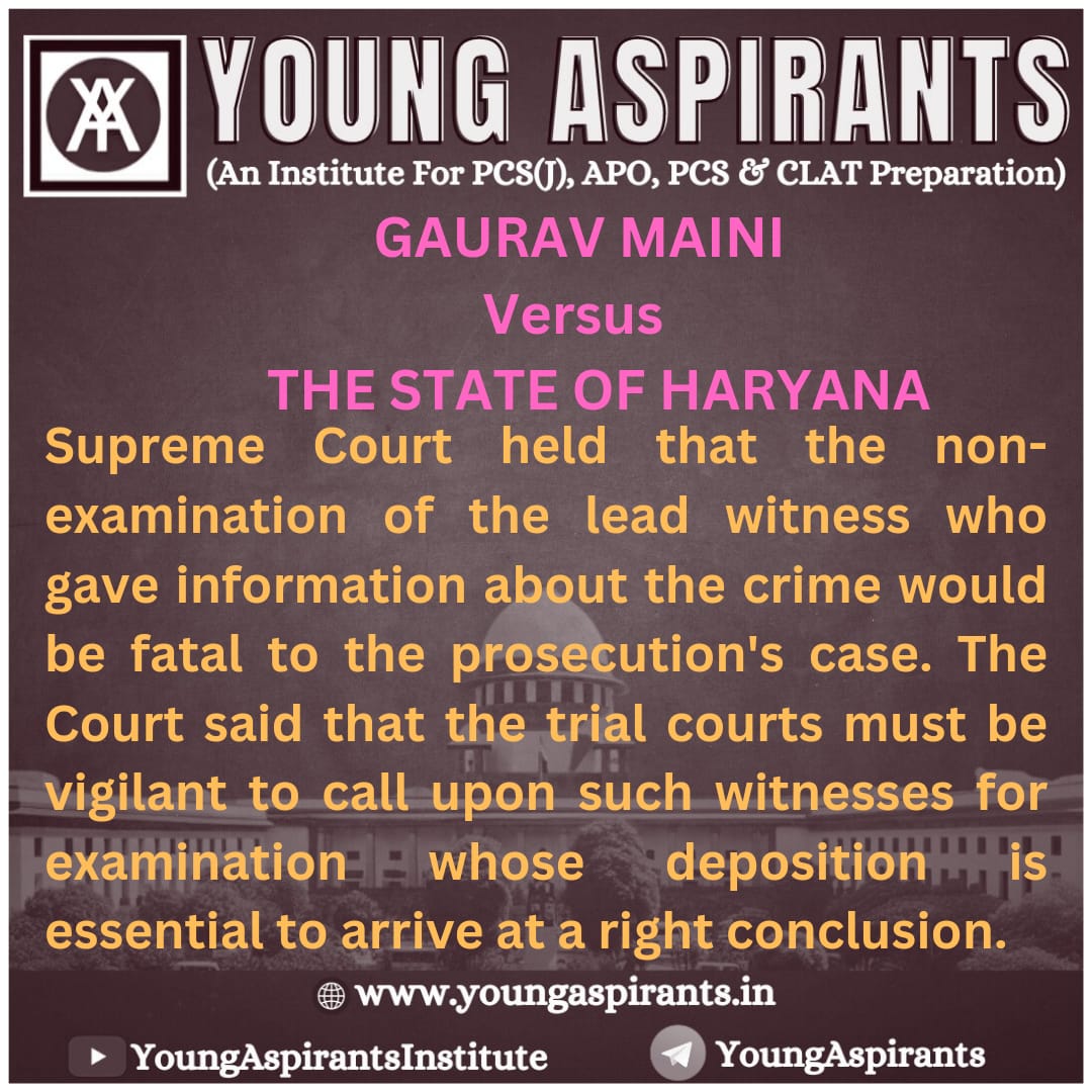 The Supreme Court held that in Gaurav Maini Vs The State of Haryana case the non-examination of the lead witness who gave information about the crime would be fatal to the prosecution’s case. The Court said that the trial courts must be vigilant to call upon such witnesses for examination whose deposition is essential to arrive at a right conclusion.